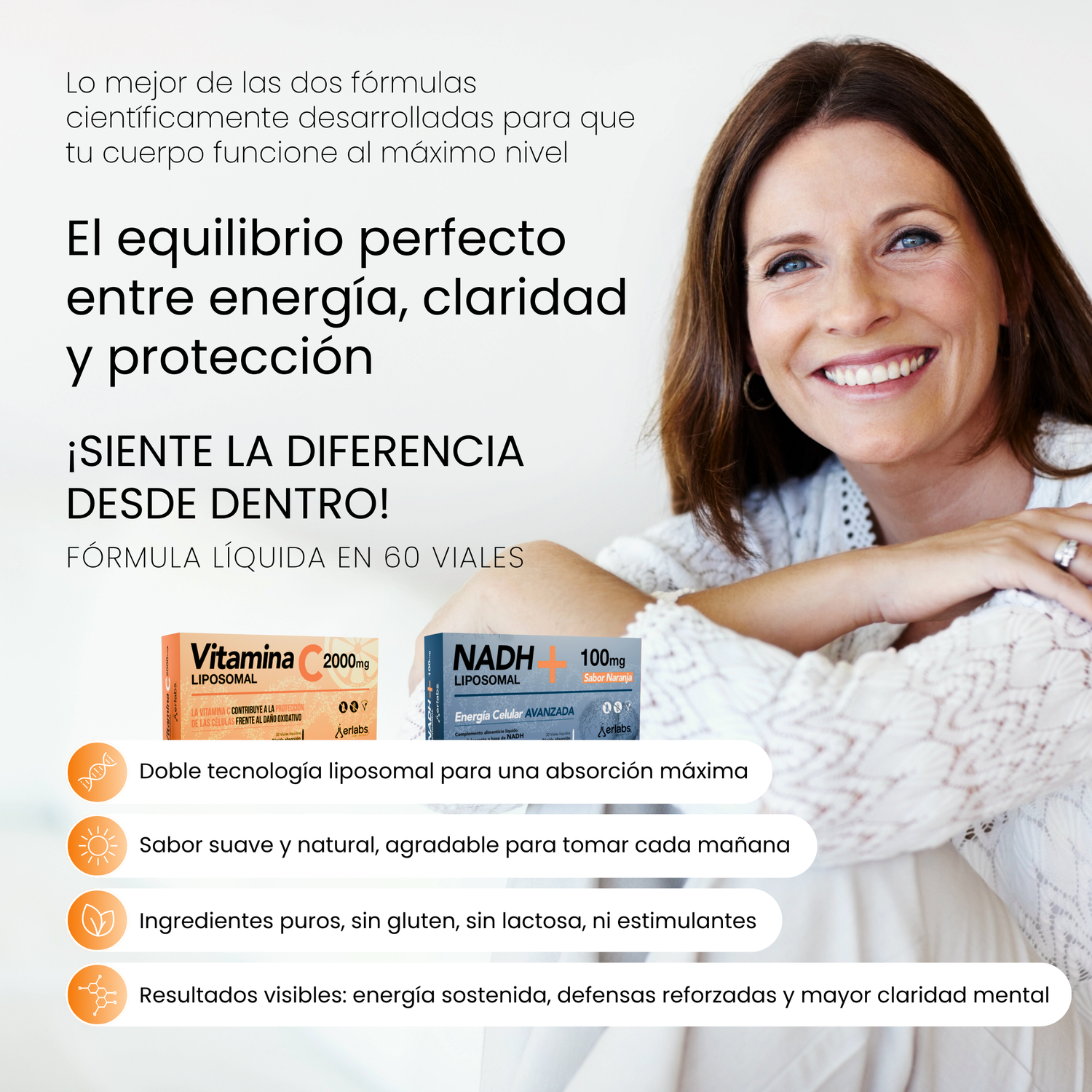Nuestro Pack Vitamina C + NADH Liposomal ha sido formulado para ofrecer una sinergia única entre energía, defensa y vitalidad.